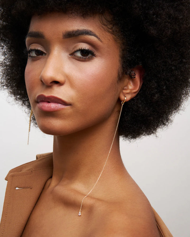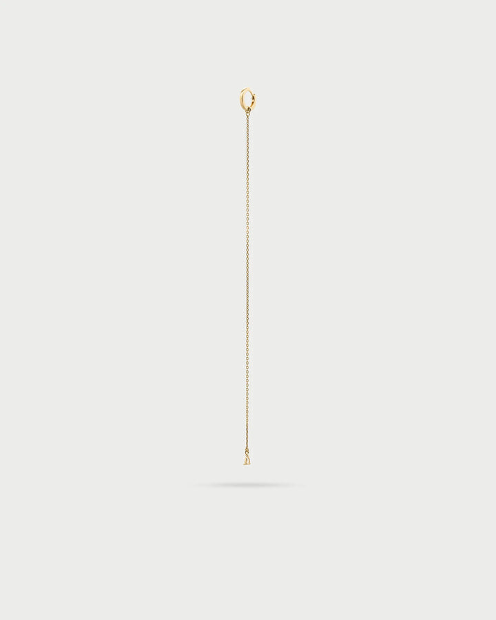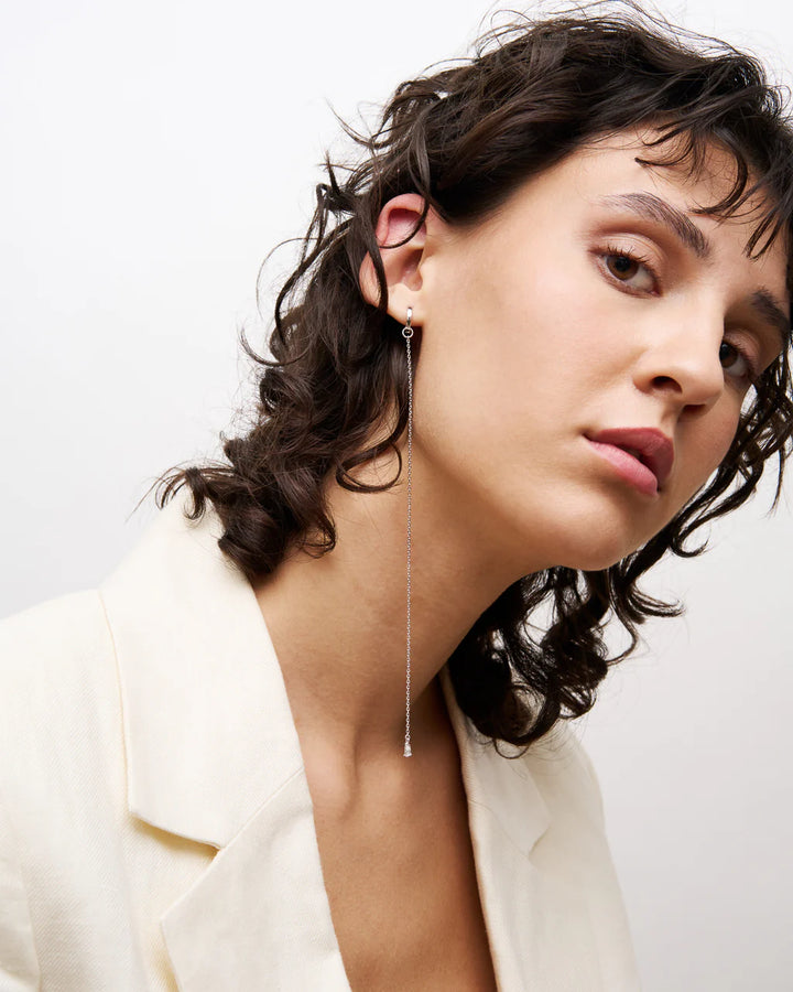 Orecchino singolo in argento 925 con cerchio piccolo, catena extra-long fine e delicata e goccia pendente finale in zircone